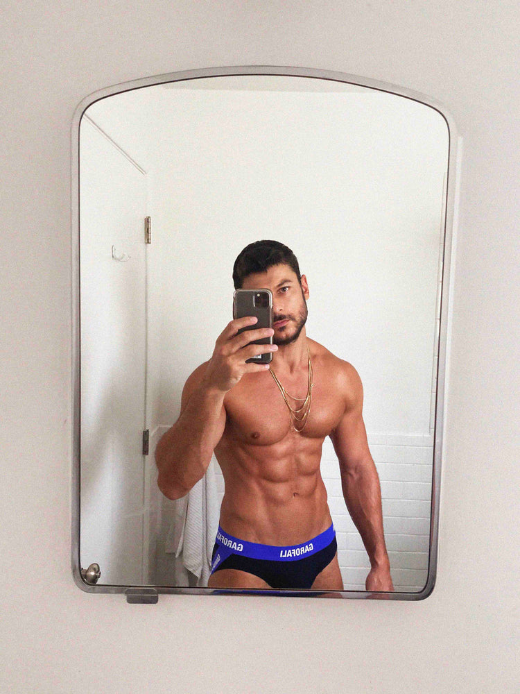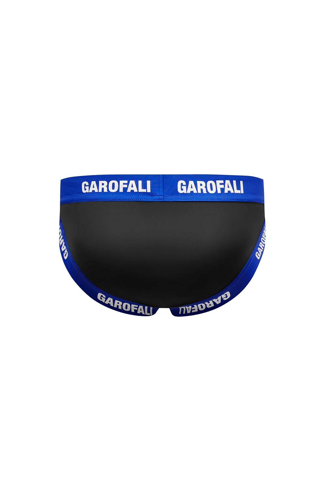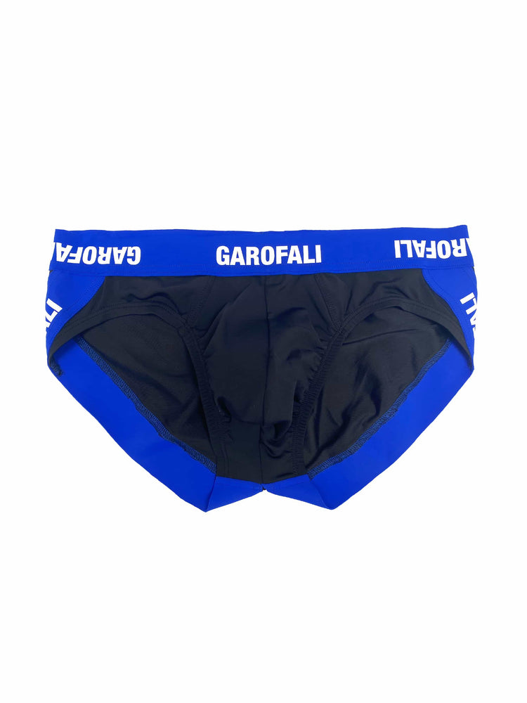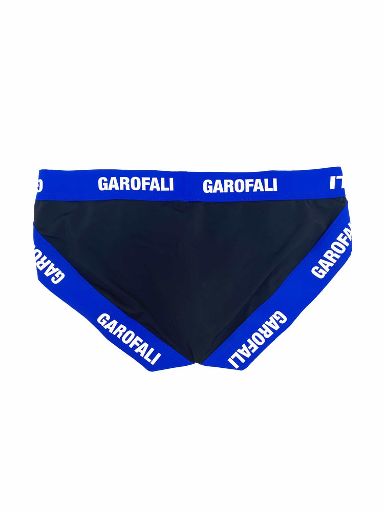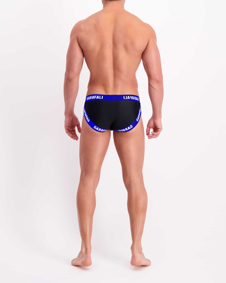 The GAROFALI Swim Jock Brief in Black w/ Blue Neoprene Waistband + White Screen Logo.