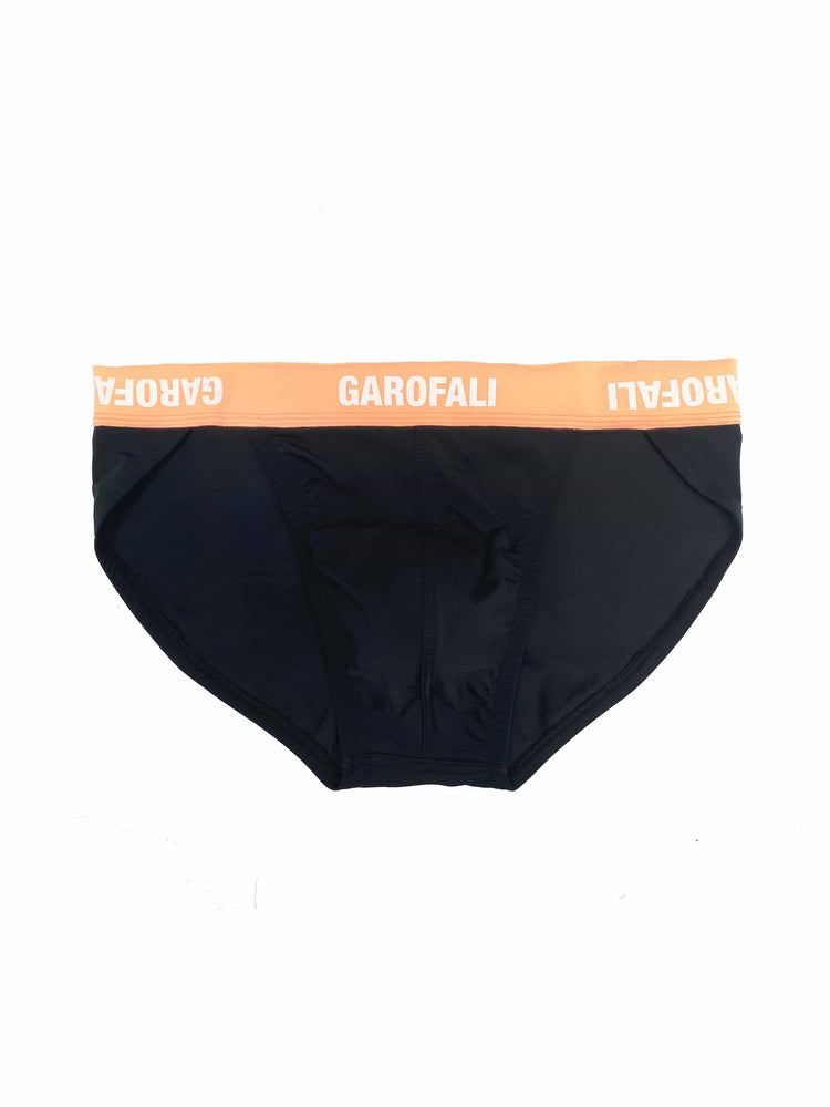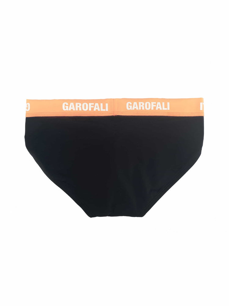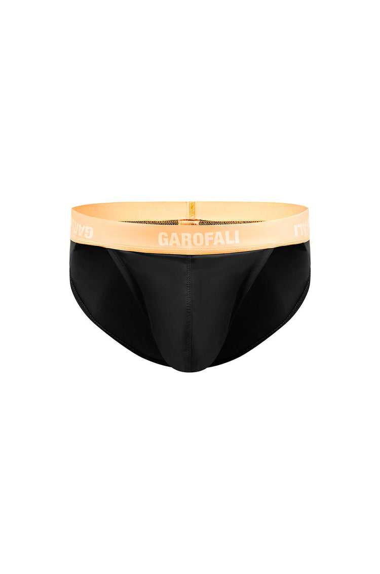 The GAROFALI Swim Split Brief in Black w/ Orange Neoprene Waistband + White Screen Logo.